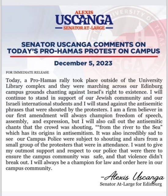 Even though the UTRGV Rider finally wrote about Uscanga’s impeachment, after sitting on it for 8 weeks during an election in which Uscanga ran as Vice President, Silvana Villarreal still got a crucial fact crucially wrong. She wrote that Uscanga commented on “the Israel-Hamas war” in his Instagram story, when he actually strictly addressed the Dec. 5 protest’s antisemitism, as even the impeachment article makes clear.