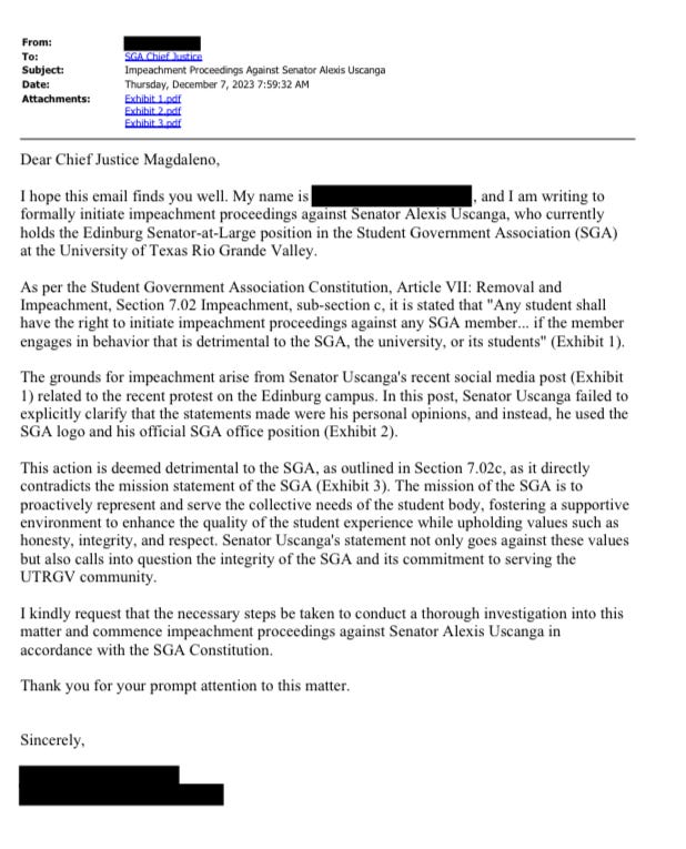 The document was not officially provided to Uscanga, which would be a violation of his Sixth Amendment right to know the charges made against him. This “article of impeachment” was also not made available to the student body or the public, again, at the insistence of student government executive leadership, headed by President Odalys Saenz, who said the petitioner requested to remain anonymous. This right here is therefore the first time the public gets to see this mysterious indictment that a kangaroo court used to prosecute Uscanga.