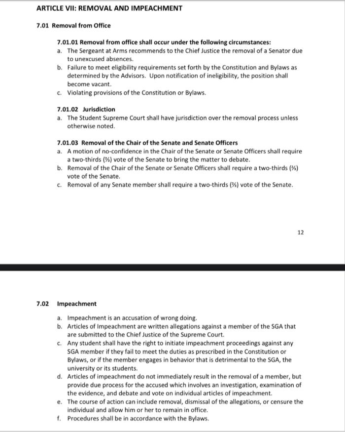 The impeachment article lists “using his SGA office” as an offense, thus within the current student government, doing your job can be an impeachable offense.