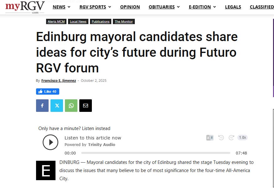 The only place I would take issue with Jimenez’ write up is in his saying I want to represent working-class “citizens,” as I made clear in the forum that fighting for amnesty for undocumented workers in Edinburg and the RGV is an important question for me and my campaign. Other positive feedback from people who attended came in as well, from folks whom I didn’t even know had attended.