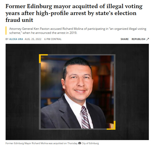Molina, as we’ll remember, was charged with state felony election voter fraud charges in 2019 of which he and his spouse were found ‘Not Guilty’ on all counts in 2022. The trial played a significant role in his 2021 reelection bid, as the “damning indictments” and bad-faith reporting in the local press was used as excuse to discredit him.