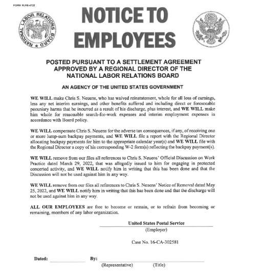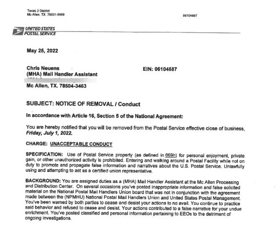 The post office claimed in their termination letter against Neuens that his union leadership also told him to do cease, though he denies this.