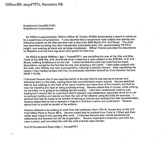 While walking to work, using the McAllen bike trails 8 May 2025, he was stopped by McAllen police officer Sergeant Isaack Tamez at around 7 p.m. Tamez informed Neuens that he matched the description regarding an individual noted in a “suspicious incident” report earlier that day in the morning, at around the time he was walking back home from work.