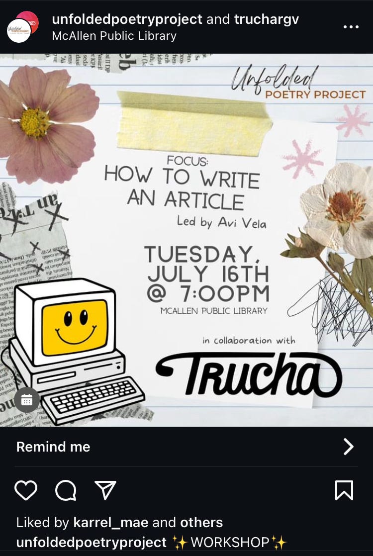— Victoria Lopez, Unfolded Poetry co-founder and 2022 McAllen Poet Laureate, Fall 2015, personal inscription in her novel, Fire In May.