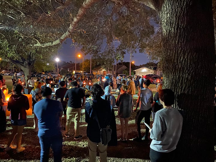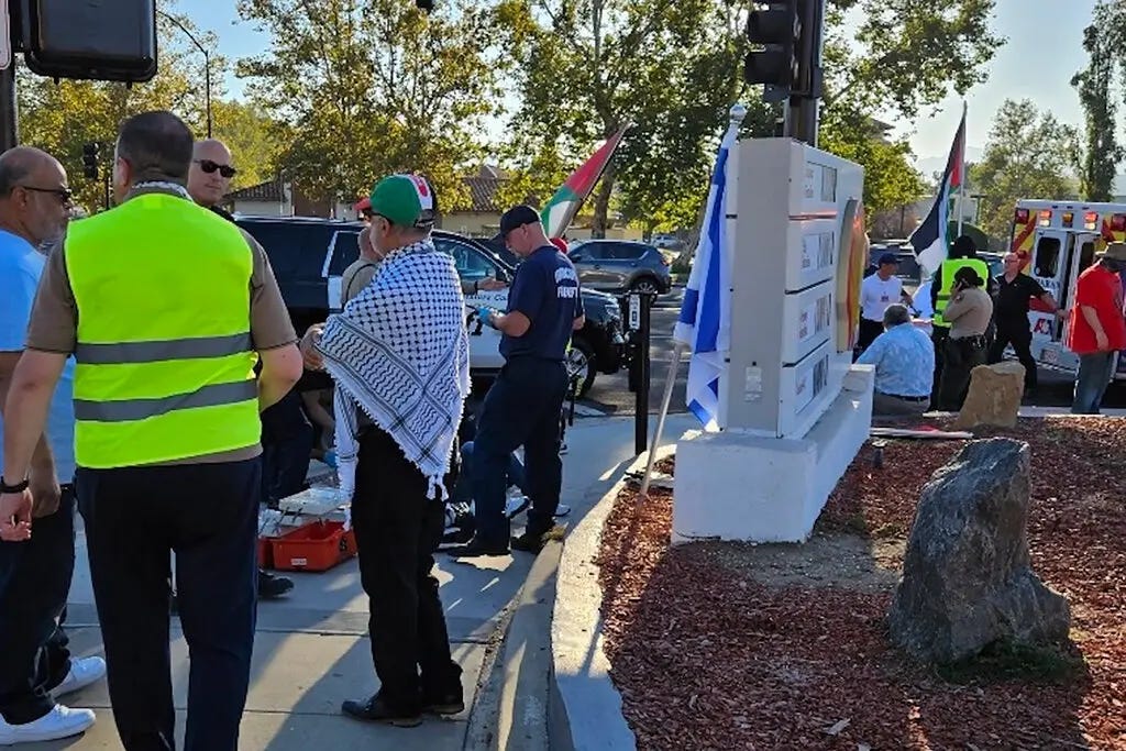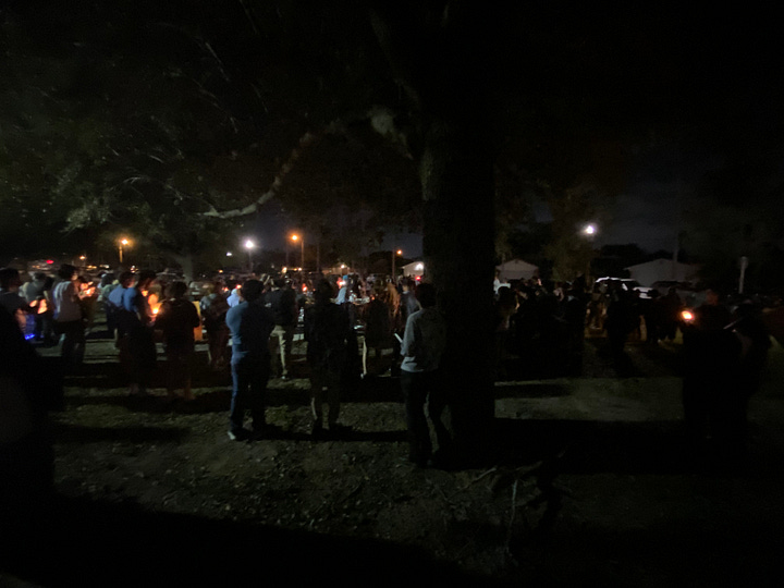 At Bill Schupp Park, as night drew early on daylight savings day, vehicles packed the small community parking lot designated for the park. Over a hundred descended to one area, near the middle. Joggers and families who had no idea the “vigil” was going to take place looked terrified at the masses of masked and draped people descending onto the park. After an hour of boring speeches, all of which centered around the demand to “defund” Israel, which in practice means destroying the Jewish state, they orgiastically chanted, “From the river to the sea…” a well-known genocidal chant.