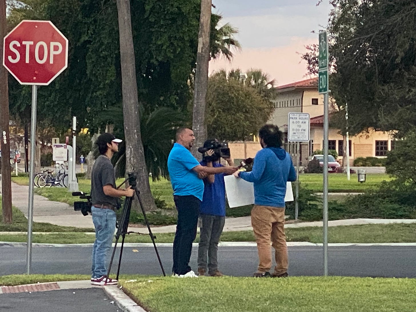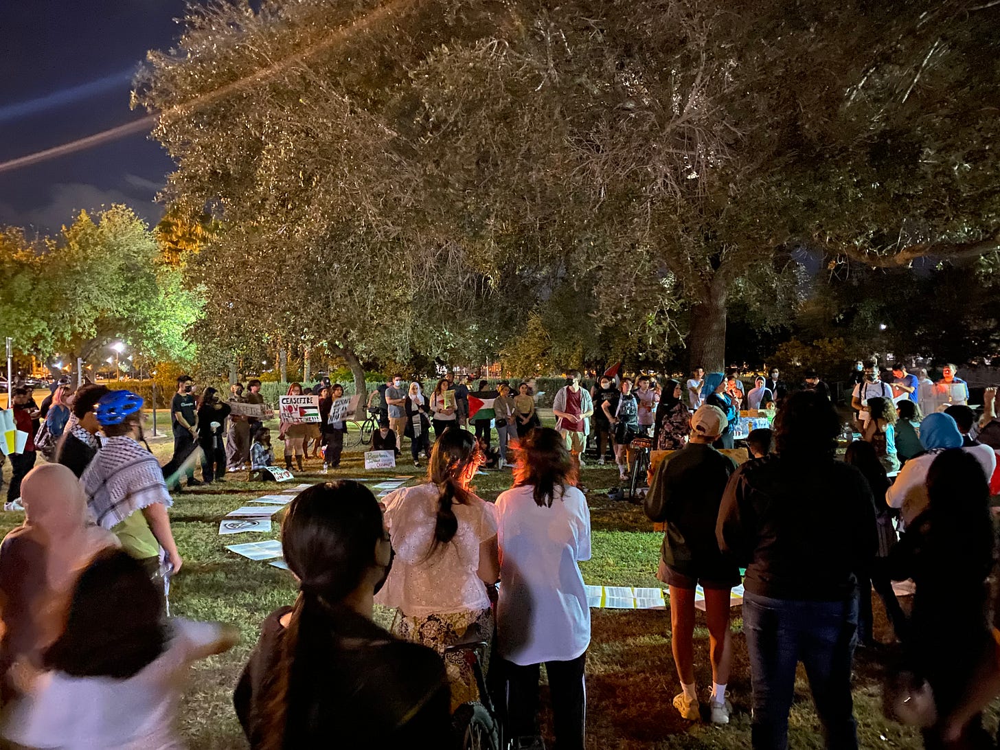 This has been the case in McAllen as well. Two Sundays ago, Oct 29, goons patrolled Archer Park for anti-Hamas attendees. They harassed me, followed me everywhere I went during the riot rehearsal, and even followed me to my vehicle. McAllen police was nowhere to be found. They did not even patrol the area, although they did place police towers nearby. Police recording equipment would also be placed at Bill Schupp Park Nov 5, but again, no police presence was visible this past Sunday night either.