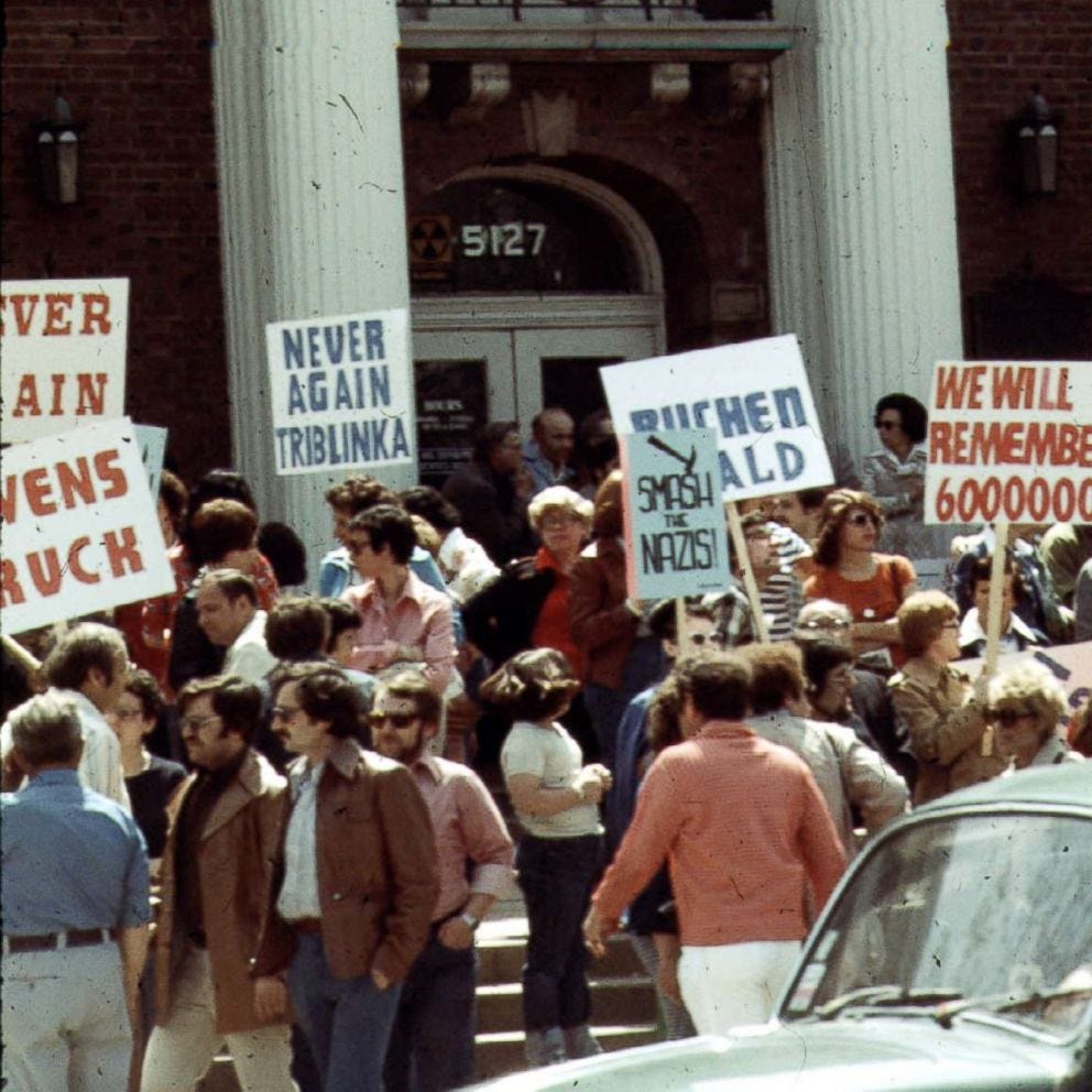 In Skokie, scores and masses of not just Jewish but non-Jewish residents came out to rally against the Nazis. They made it clear that if the Nazis rallied in their town, they would be massively outnumbered, and it would be they who the police may not be able to handle. After gaining the okay to rally from the U.S. Supreme Court, who did not even hear opening arguments, the Nazis ended up changing the location of their rally to Chicago, where police were willing to guarantee their protection.