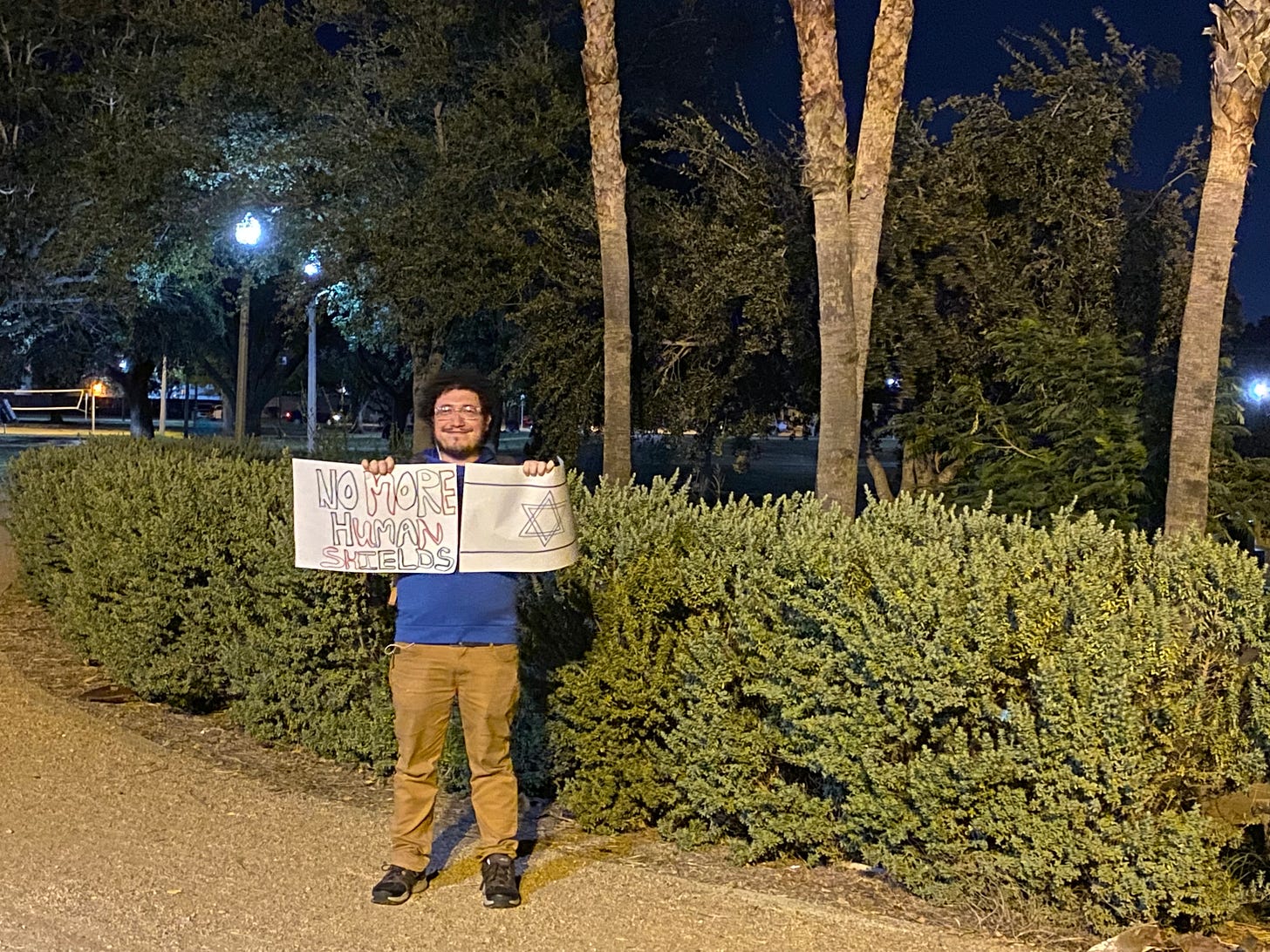 I kept my distance, standing at an intersection of multiple trails, so people could read my placard and see my Israeli placard. During my 45 minutes holding post, several individuals and families walked by, smiled at me, and gave me thumbs up. But attendees gave me disturbed grimaces. One young woman said, “Fuck you, bitch!” after reading my placard saying, “No More Human Shields”. Two attendees played good cop and “invited” me to join the “vigil”, but I wanted nothing to do with it. It did not honor the Israeli dead, perhaps because they don’t recognize Israelis as civilians.